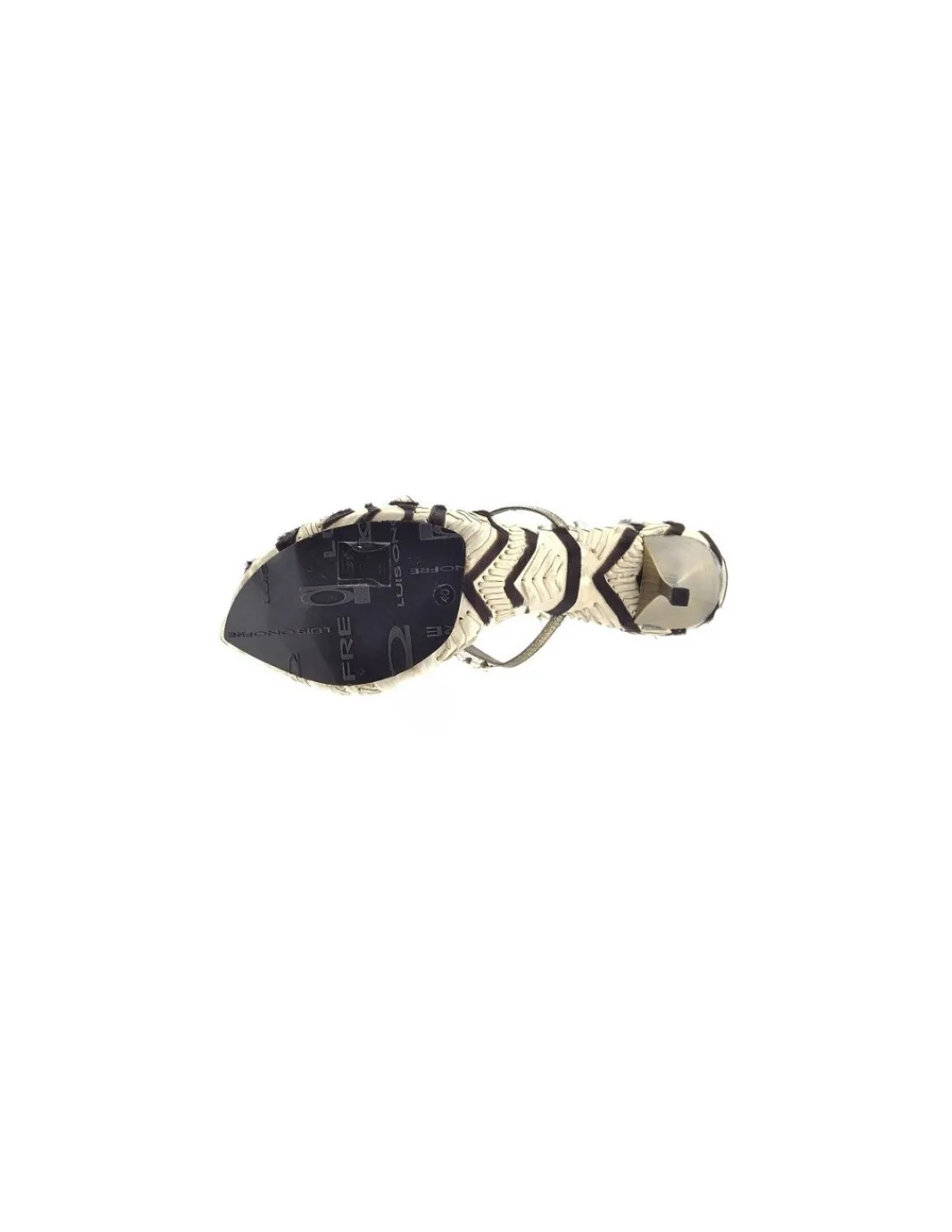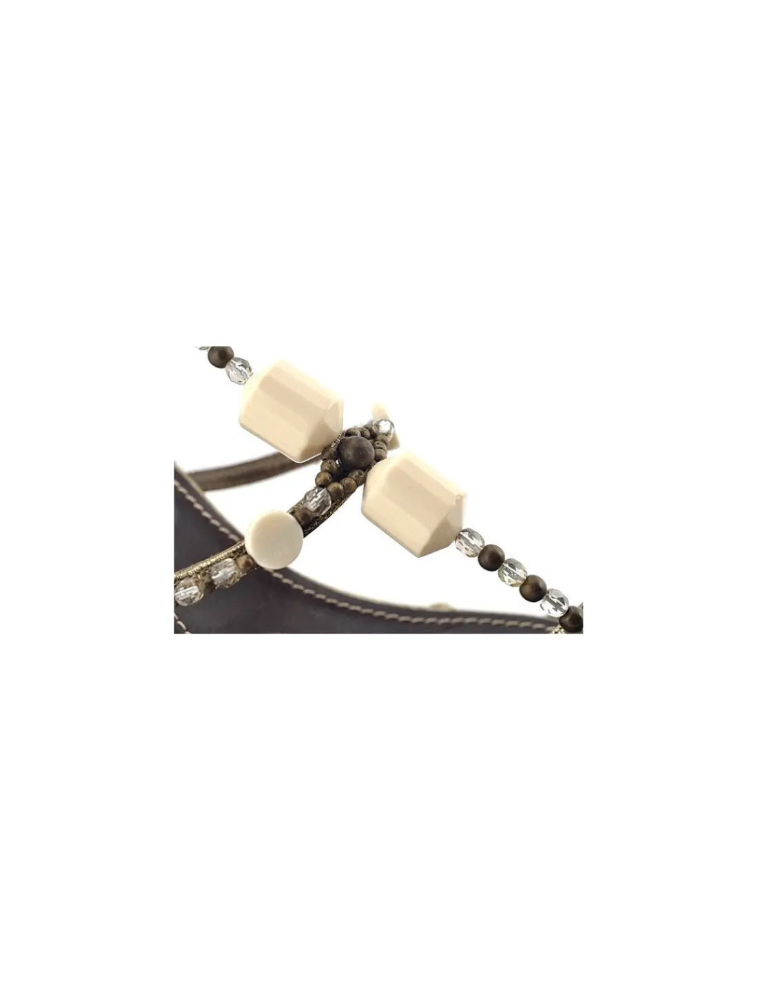 Kilka elementów które składają się na sukces tego modelu warte są poświecenia uwagi : Zelówki to część monobloku – sztywnej nie zginającej się części, ale profilowanej do niewysokiego skłonu. Monoblock oprawiony w ręcznie wykonaną kompozycję skór bydlęcych z zachowanym włosiem w które wkomponowane zostały ręcznie ozdobne szycia i stebnowania rzemieniem w połączeniu z bi-kolorem tych skór, efekt końcowy każdej pary jest inny. Piękna matowa biżuteria korali naszytych na paseczki i połączonych z mosiężnym łańcuchem okalającym nogę tuż nad kostką.