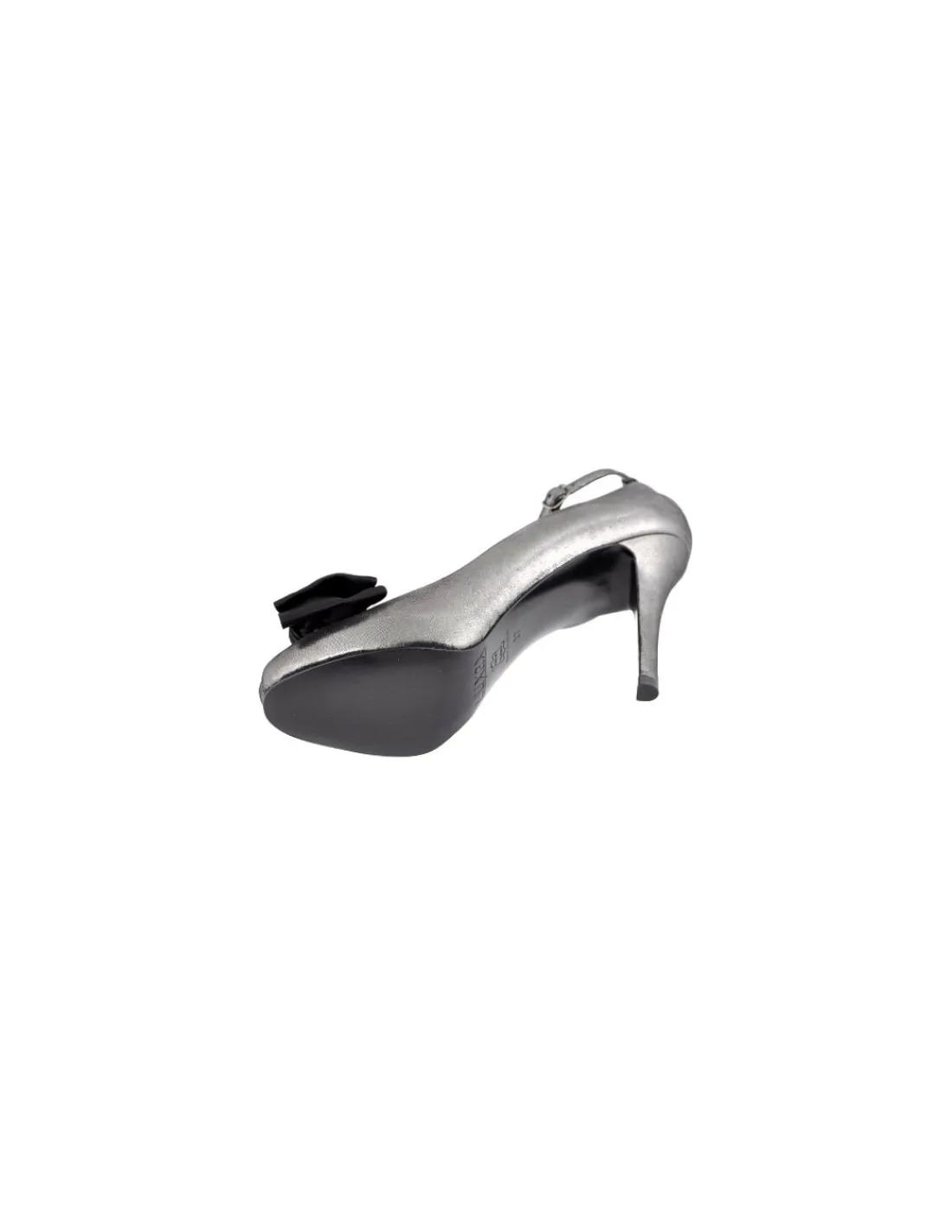 Szpilki wykonane są z najwyższej jakości, miękkiej skóry nubuk w kolorze starego srebra, ołowiany, metaliczny odcień . Forma okrągła z otwartym noskiem. Otwór na palce zwany „Peep Toe” jest bardzo dobrze zaprojektowany. Stopy bezpiecznie osadzone w szpilkach z widocznymi końcówkami palców prezentuje się zjawiskowo, kobieco i elegancko. Efektownym rozwiązaniem jest ozdoba w postaci dużej, kilkuwarstwowej kokardy z czarnej, jedwabnej wstążki. Wewnątrz futrówki oraz logowane wkładki wykonane są ze skóry licowej w srebrnym kolorze. Dodatkowo pod skórzaną wkładką umieszczono miękki silikonowy dodatek podnoszący komfort użytkowania.