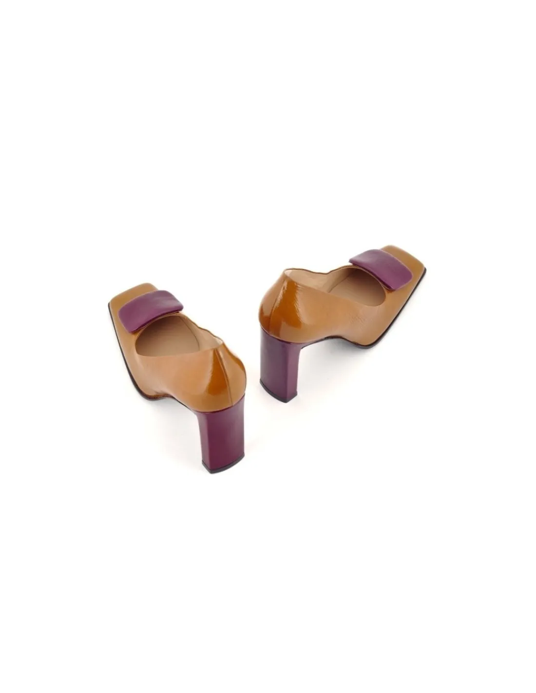Prostokątne ozdoby oraz obcasy zostały obłożone skórą w kolorze amarantowym. Klasyczna linia tego modelu i absolutnie unikatowe zestawienie kolorystyczne przykuwa uwagę. Noski zdecydowanie kwadratowe.
