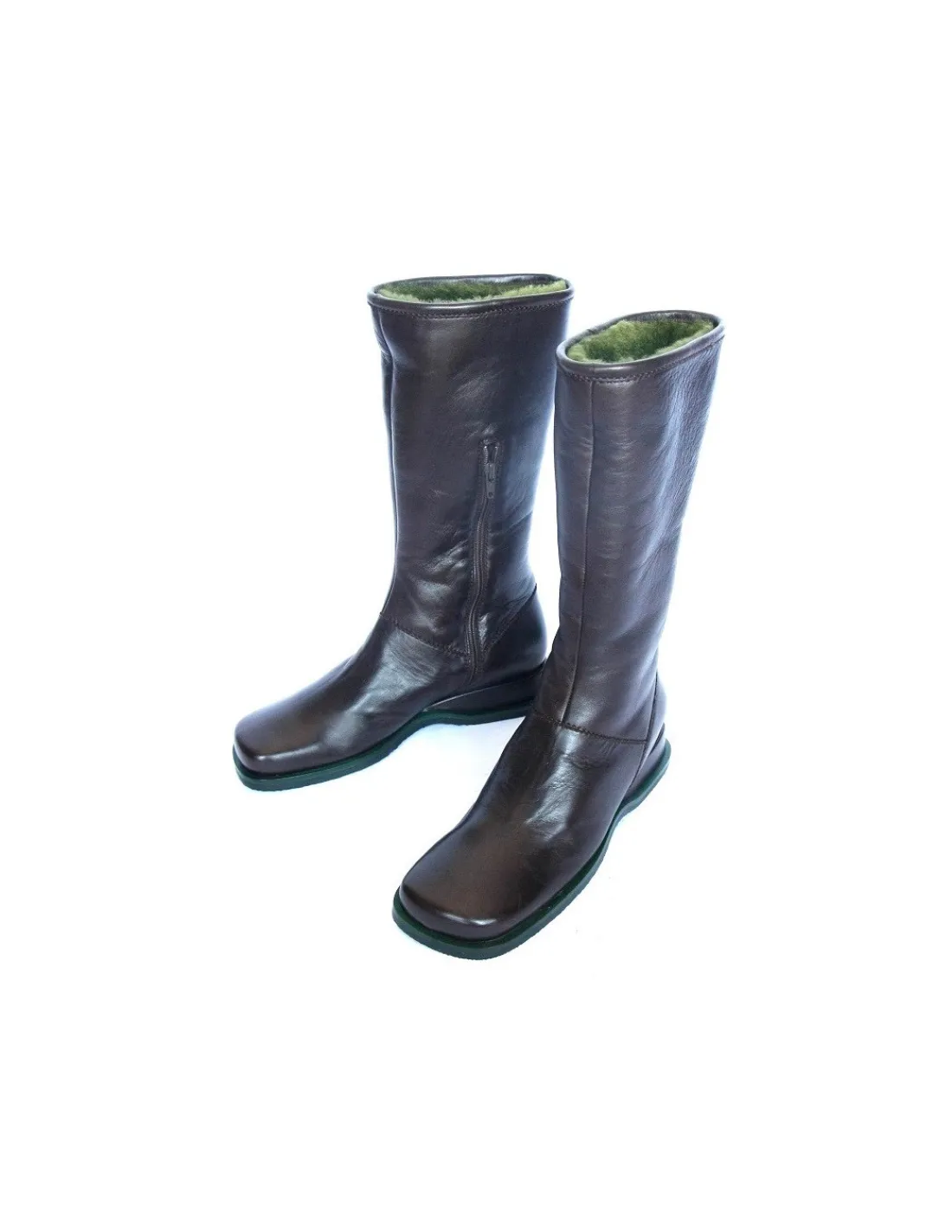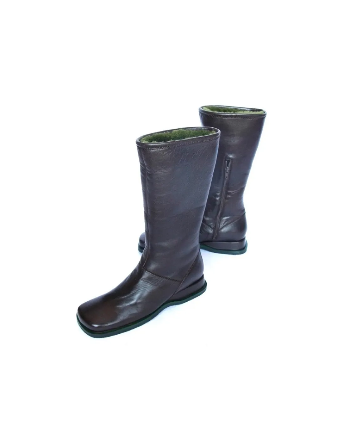 Tym sposobem zmieniamy nieco styl i charakter kozaków, eksponujemy świetnie prezentujące się w kontraście do czekoladowej skóry zielone, naturalne baranie runo. Kozaki bez zbędnych cięć i szyć, szerokie przeznaczone również dla osób z wrażliwymi stopami. Są bardzo ciepłe, ewidentnie dla poważnych zmarzluchów.