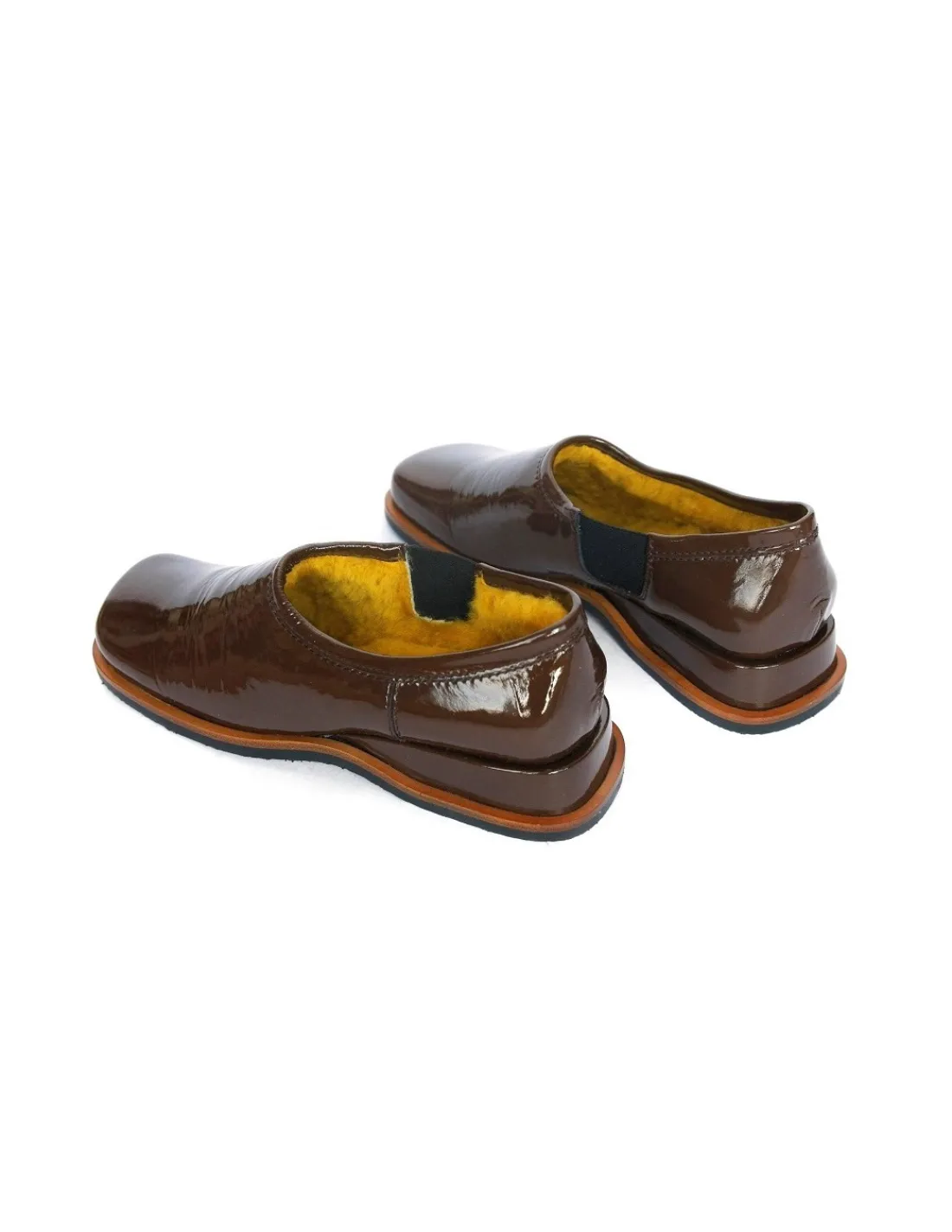 Półbuty są wsuwane, cholewki posiadają elastyczne gumy po stronie przyśrodkowej. Wewnątrz świetnie prezentujące się w kontraście do czekoladowej skóry żółte, naturalne owcze runo. Skórzane ranty zelówek wychodzą poza obrys cholewek i ta część jest w naturalnym kolorze, który świetnie komponuje się z lakierem.