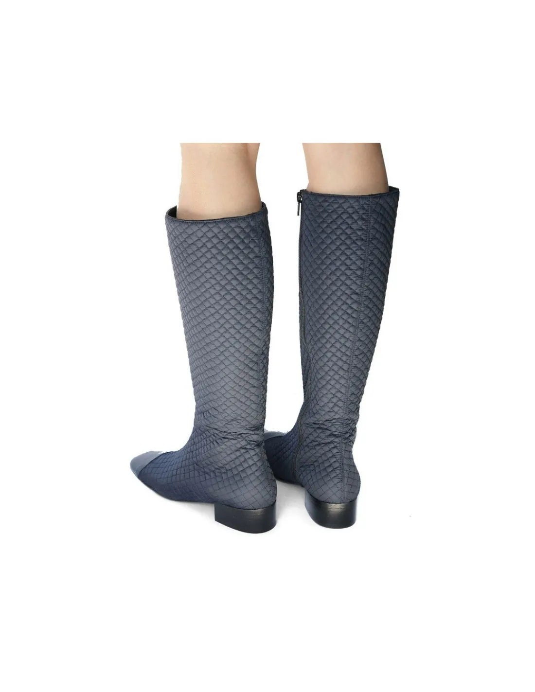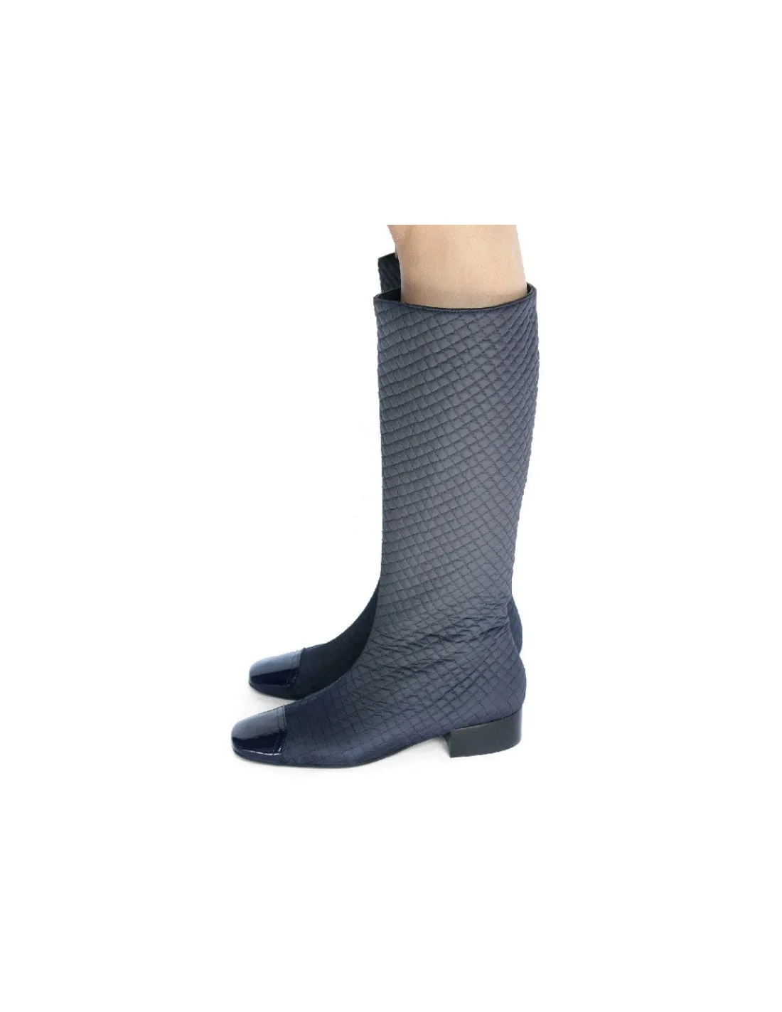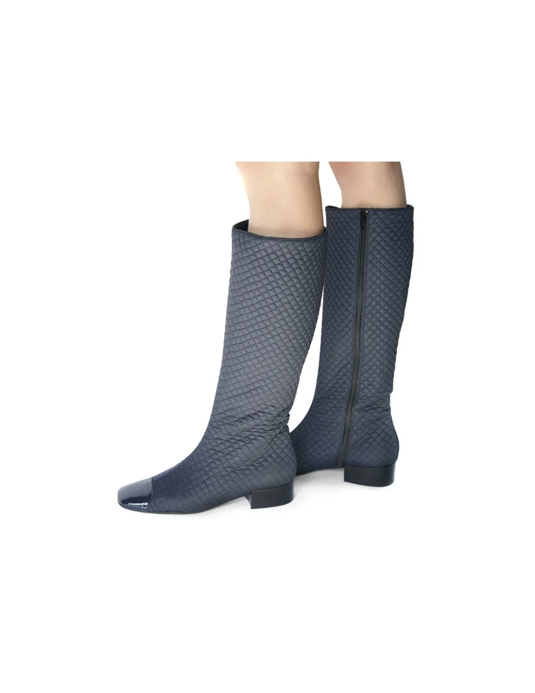 Cholewki wykonane są z tkaniny technicznej, impregnowanej, o właściwościach wodoszczelnych, pikowanej w niewielkie kwadraty, która delikatnie odbija światło (jak nylon na kurtkach puchowych). Kolor granatowy. Nosek kozaków wykończony jest skórą lakierowaną w dopasowanym odcieniu granatu. Wewnątrz wkładki i futrówki w całości ze skóry. Cholewka zapinana na zamek od strony przyśrodkowej na całej swojej długości. Zelówki miękkie z elastycznego tworzywa, logowane. Obcas prosty w formie, typu męskiego w czarnych, skórzanych obłogach.