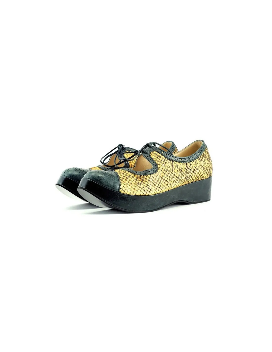 Wykonane z połączenia dwóch rodzajów i kolorów skór. Przypuszczam że tu Was zaskoczymy bowiem wszyscy nasi rozmówcy bywają przynajmniej zaskoczeni. W przeważającej części ta para butów wykonana jest z odpowiednio wyprawionej skóry z łososia !!! Podczas garbowania zachowano jej strukturę i wybarwiono na metaliczny, złoty kolor. Efekt absolutnie genialny. Noski i wykończenia cholewek, oraz platformy obłożone są skórą licową w ciemnym, zielonym kolorze. Jest ona wyprawiona w specjalny sposób, aby uzyskać lekko spękaną powierzchnię i pożądany efekt vintage. Na noskach efektowna, ręcznie wykonana, ażurowana rozeta z maleńkimi dziureczkami.