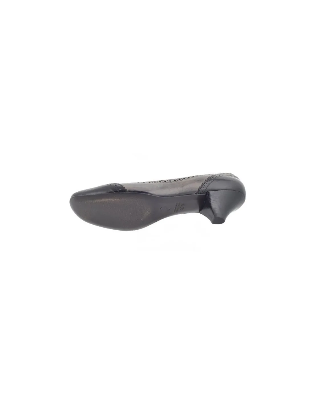 Forma nosków okrągła, dość szeroka – z łatwością mieści palce stóp. Na czarnym nosku ażurowane łączenia skór i perforację w kształcie niewielkiej rozety. Na szarej części cholewki dziurkowania wokół wycięcia sięgają do pięty. Takie ozdobne wykończenie nawiązuje do męskich butów zwanych golfem angielskim.