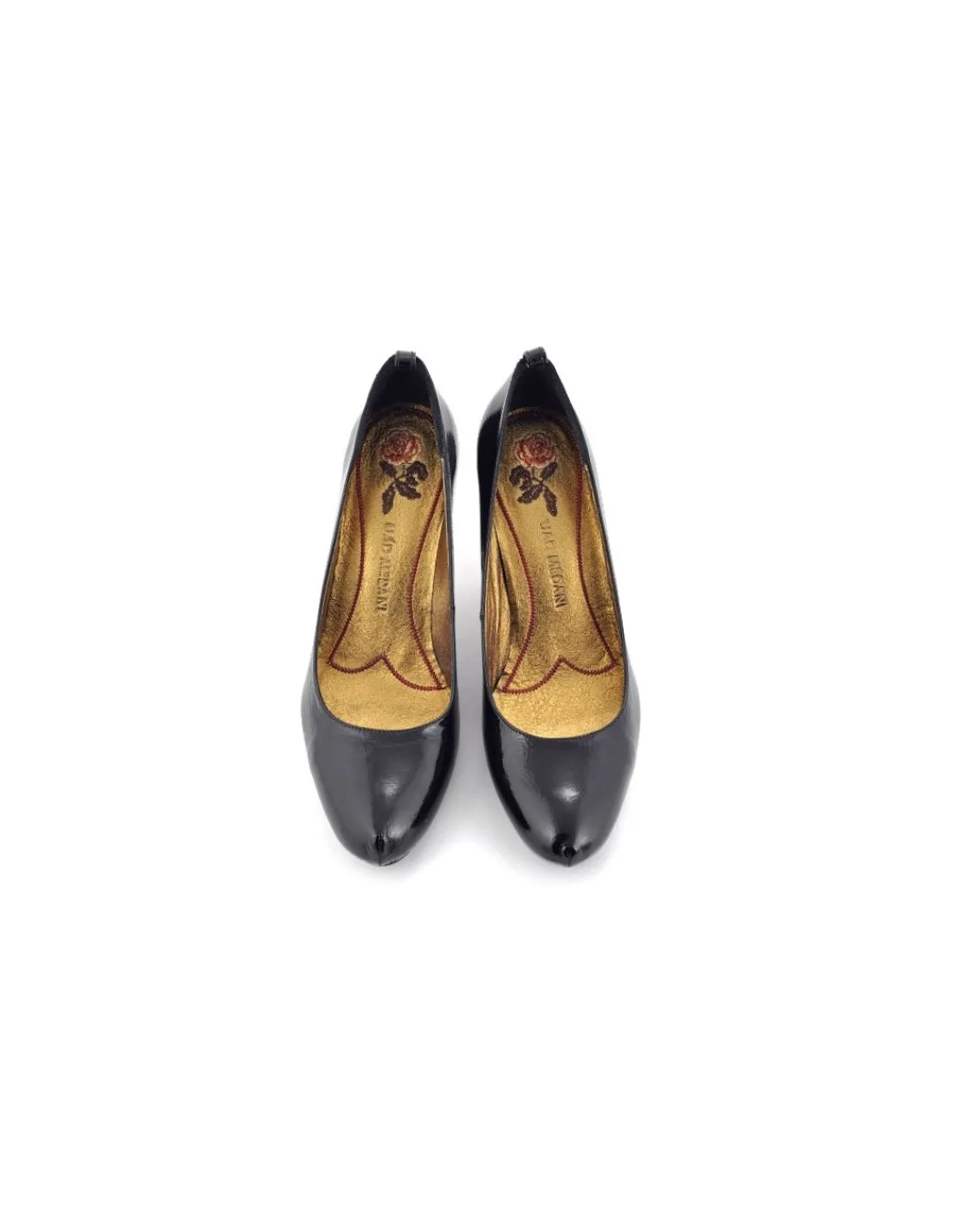 Wykonane z wysokiej jakości naplaku, czyli lakieru kładzionego na luźno położoną skórę. Dzięki tej technice buty są bardzo, bardzo miękkie, skóra doskonale dopasowuje się do stóp. Po założeniu większość widocznych na skórze zgięć rozprostowuję się tworząc gładką powierzchnię. Całość dopracowana na najwyższym poziomie przez mistrzów sztuki szewskiej. Kolor czarny. W komplecie z obuwiem producent dołączył czarny, lakierowany paseczek, który można przełożyć przez widoczną szlufkę i zapiąć na wysokości kostki. Paseczek zapinany na niewielki skórzany guziczek, istne krawieckie wykończenie jak za dawnych lat. Forma czółenek lekko wysmuklona, a noski okrągłe nieco podniesione co dodatkowo zaakcentowano pionowym szwem. Wewnątrz futrówka z jedwabistej w dotyku, miękkiej skóry nappa w kolorze złota. Pod pięta wyhaftowana róża – znak rozpoznawczy marki Uad Medani.