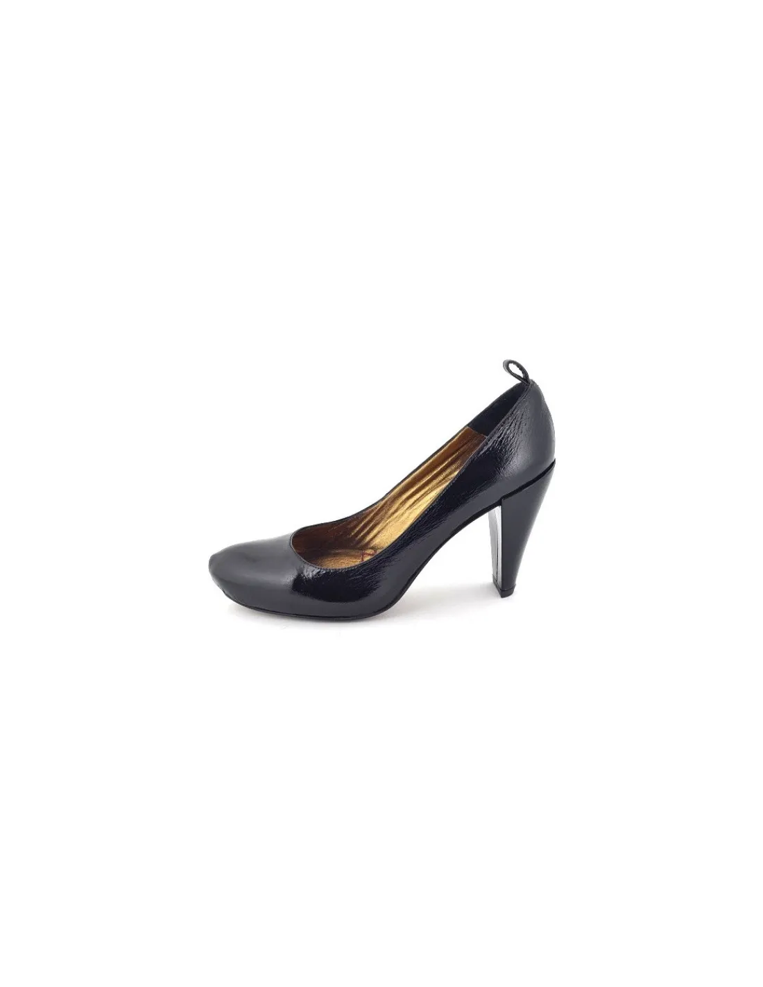 Pod śródstopiem znajduje się ukryta wewnętrzna platforma o wysokości ok. 1,3 cm. Takie rozwiązanie obniża odczuwany skłon stóp co podnosi komfort i jakość użytkowania bez utraty lekkości w wyglądzie tego modelu. Kopyto jest świetnie wyprofilowane. Obcasy o unikatowym kształcie są bardzo stabilne. Patrząc na nie od tyłu są szersze natomiast z boku węższe. Obłożone czarną skórą lakierowaną, ta samą z której wykonano te parę.