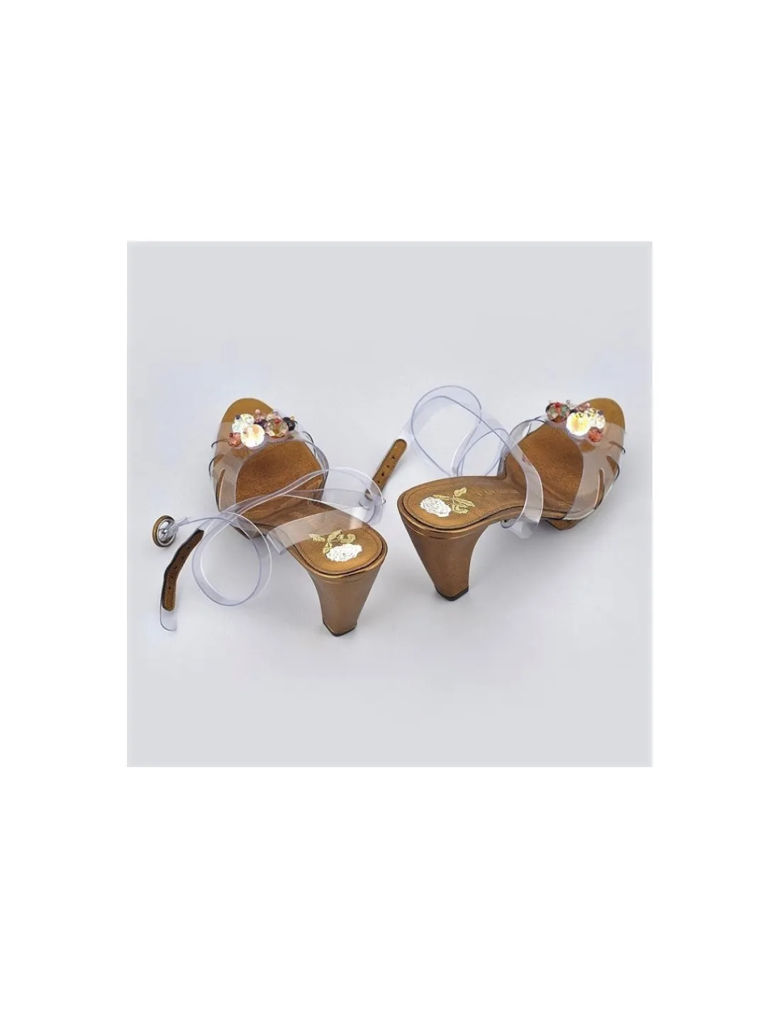 Dodatkowo zamontowany jest pasek winylowy, przejrzysty, który okala stopę powyżej kostek i zapinany jest na okrągłą klamerkę obłożoną skóra z której wykonano sandałki.