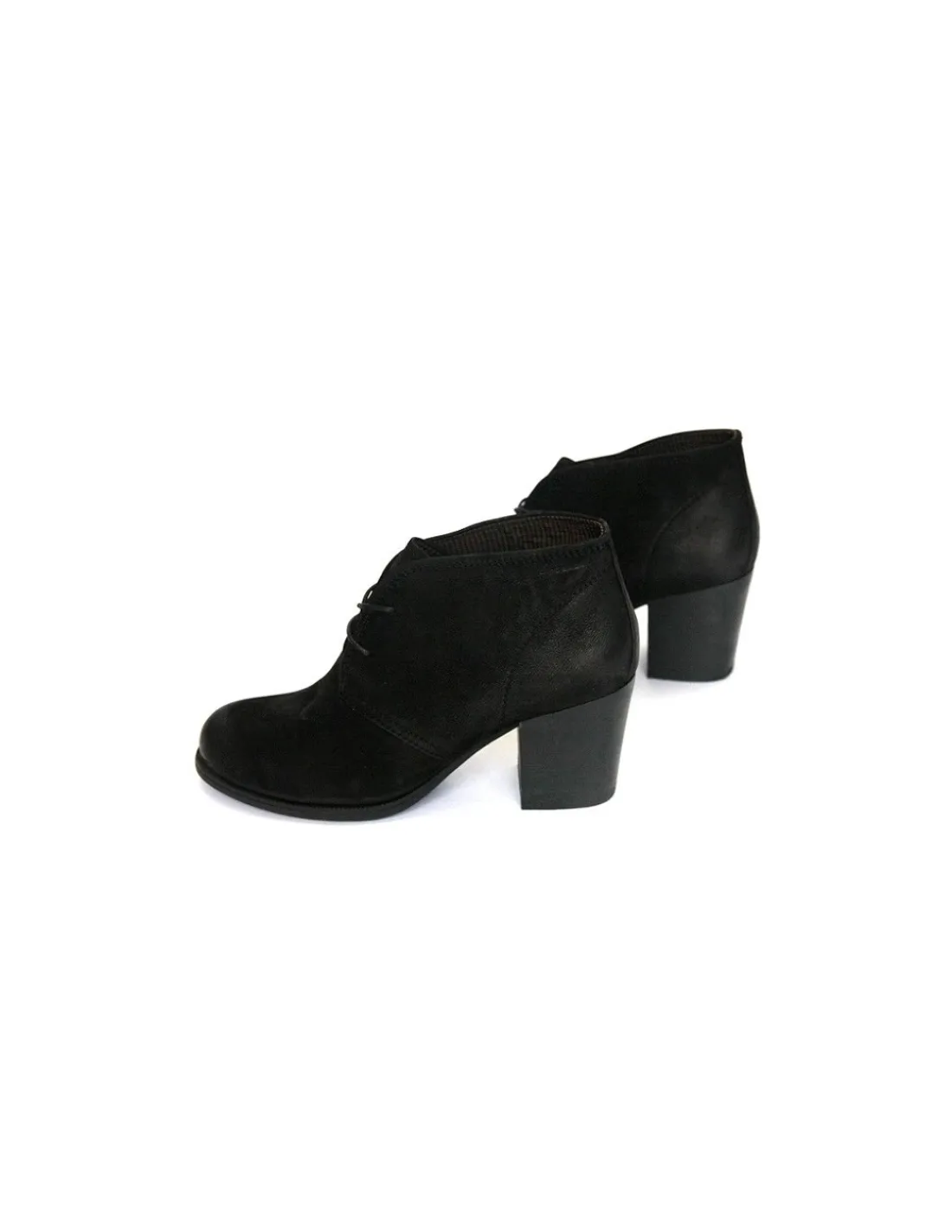 Trzewiki na stabilnym obcasie, takie co to zawsze do wszystkiego pasują. Linia prosta, klasyczna. Wykonane z niezwykle miękkiej skóry nubukowej w kolorze czarnym. Cholewka z dwurzędowymi sznurowadłami.
