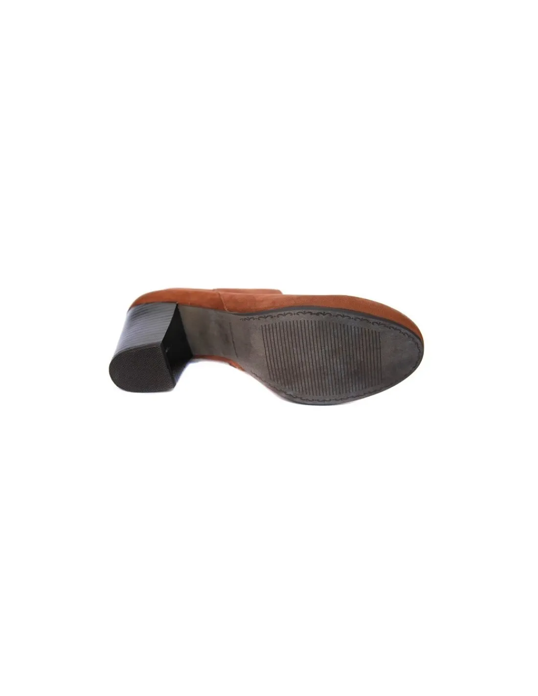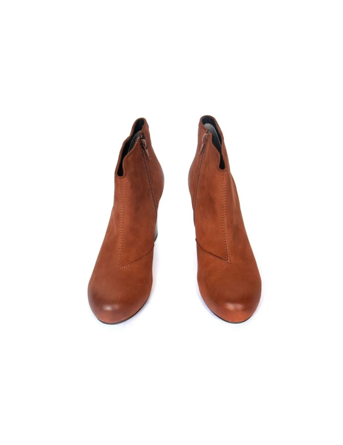 Botki wykonane z niezwykle miękkiej skóry nubukowej w kolorze rudo – koniakowym. Skóra nubukowa antykowana w stylu vintage na noskach i pietach. Taki rodzaj skóry możemy za pomocą pastowania i wypolerowania zamienić w skórę licową (proszę nie mylić nubuku z zamszem).