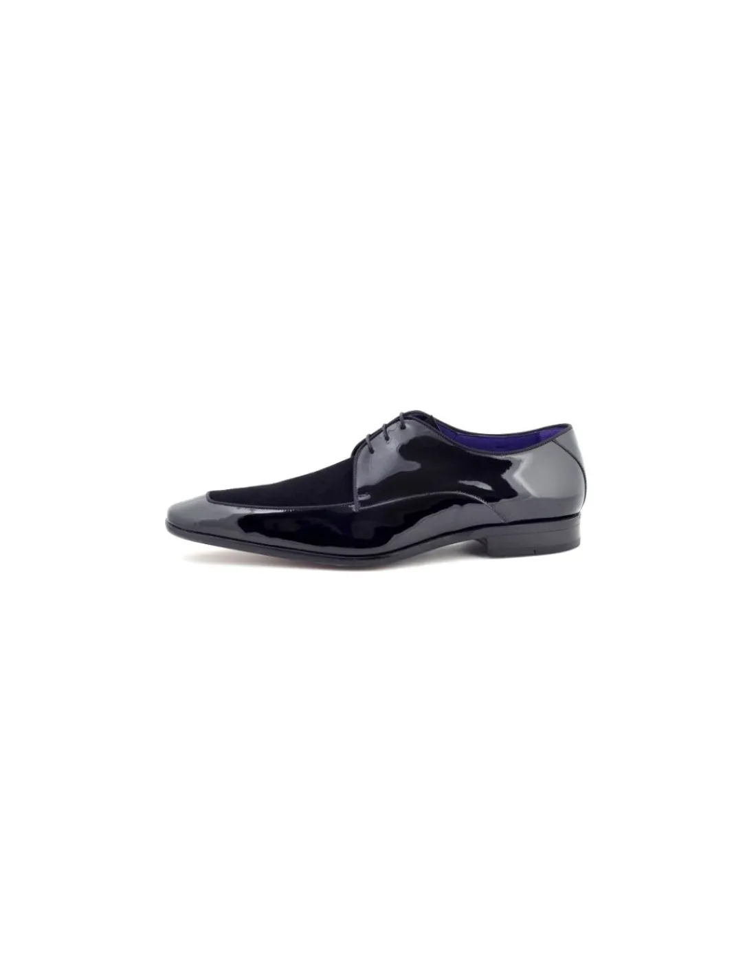 Zostały wykonane z połączenia skóry lakierowanej i zamszu w klasycznym czarnym kolorze w całości wykończone rypsowym rulonikiem. Zamszowa wstawka w miejscu zginania stóp oraz na podbiciu ma za zadanie zwiększenie odporności na zginanie i polepszenie komfortu podczas użytkowania. Model derby, przeznaczony na wyższe podbicie , sznurowany czarnymi woskowanymi sznurowadłami na 3 dziurki.